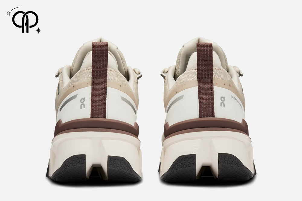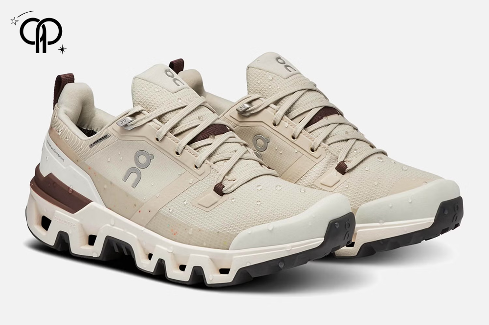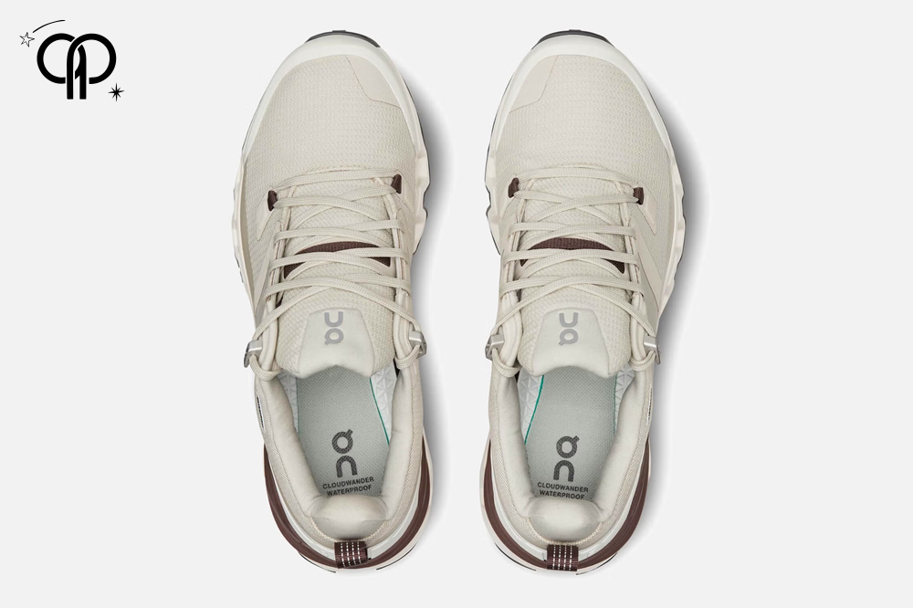 حذاء نسائي اون راننج أبيض a Women's On Cloudwander Waterproof hiking shoe in the Sand/Ivory colorway.